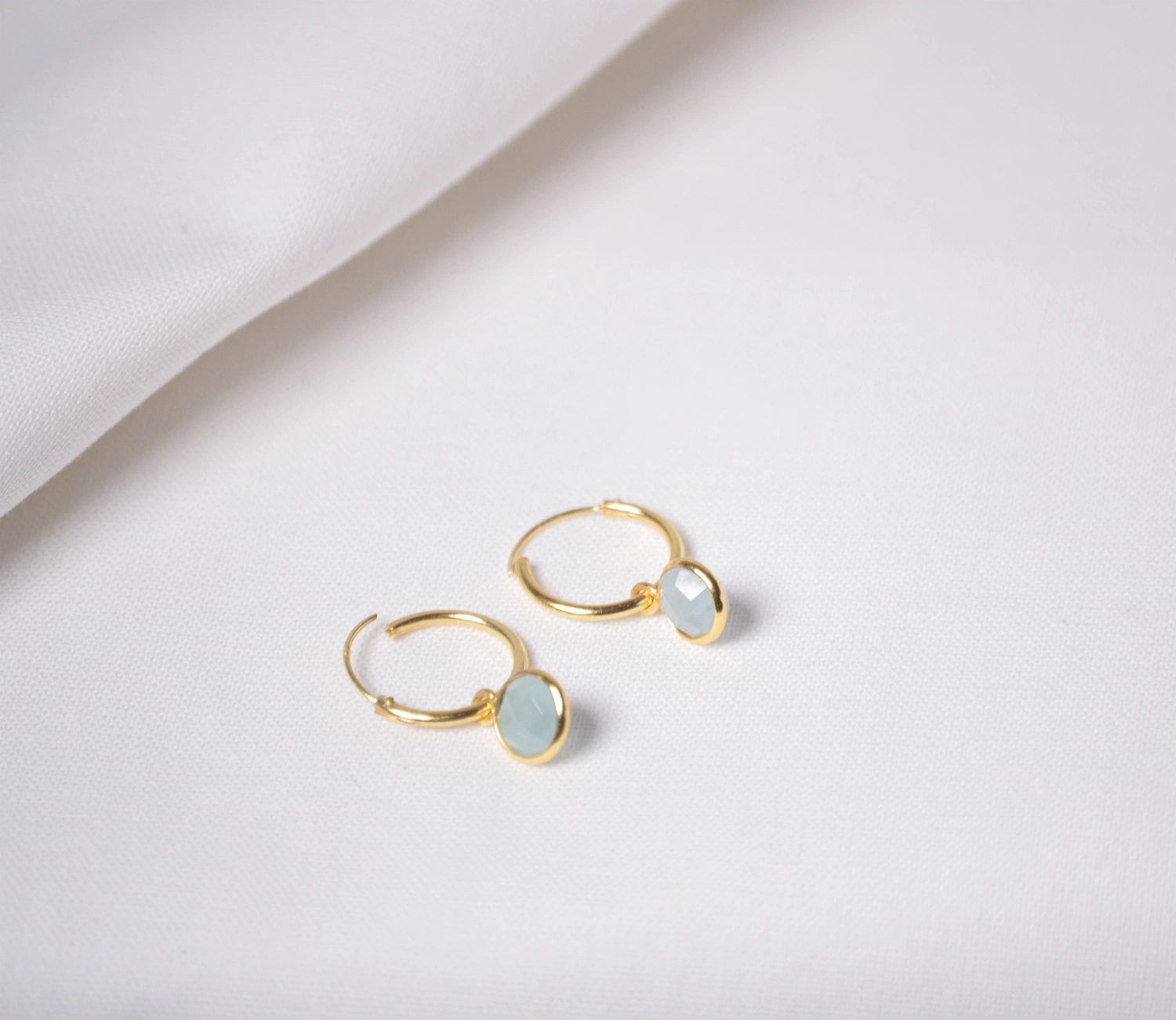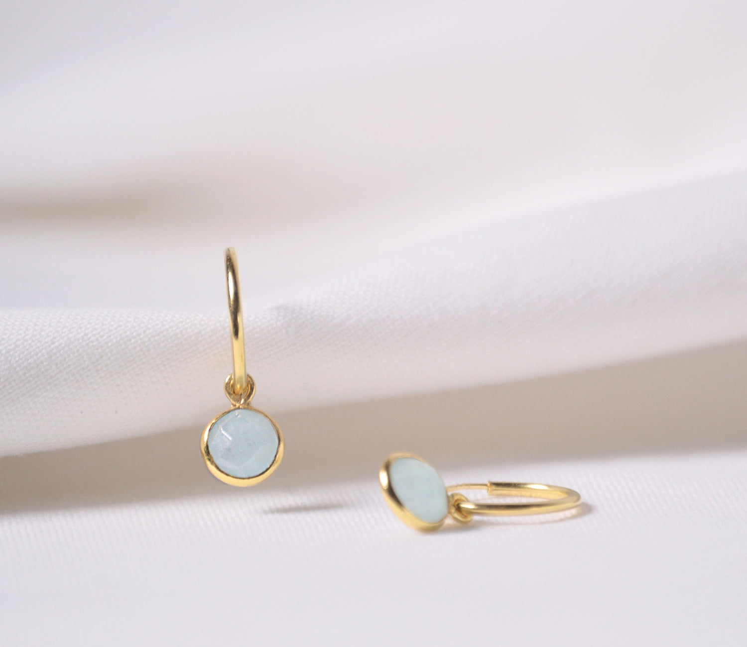 These trendy Aquamarine gold hoops feature a small round gemstone hanging from a 14K gold-filled, Sterling Silver or 14k Rose gold finished huggies hoops, depending on your selection. These lovely earrings are ready to become one of your favourites for everyday wear or the perfect unique gift!