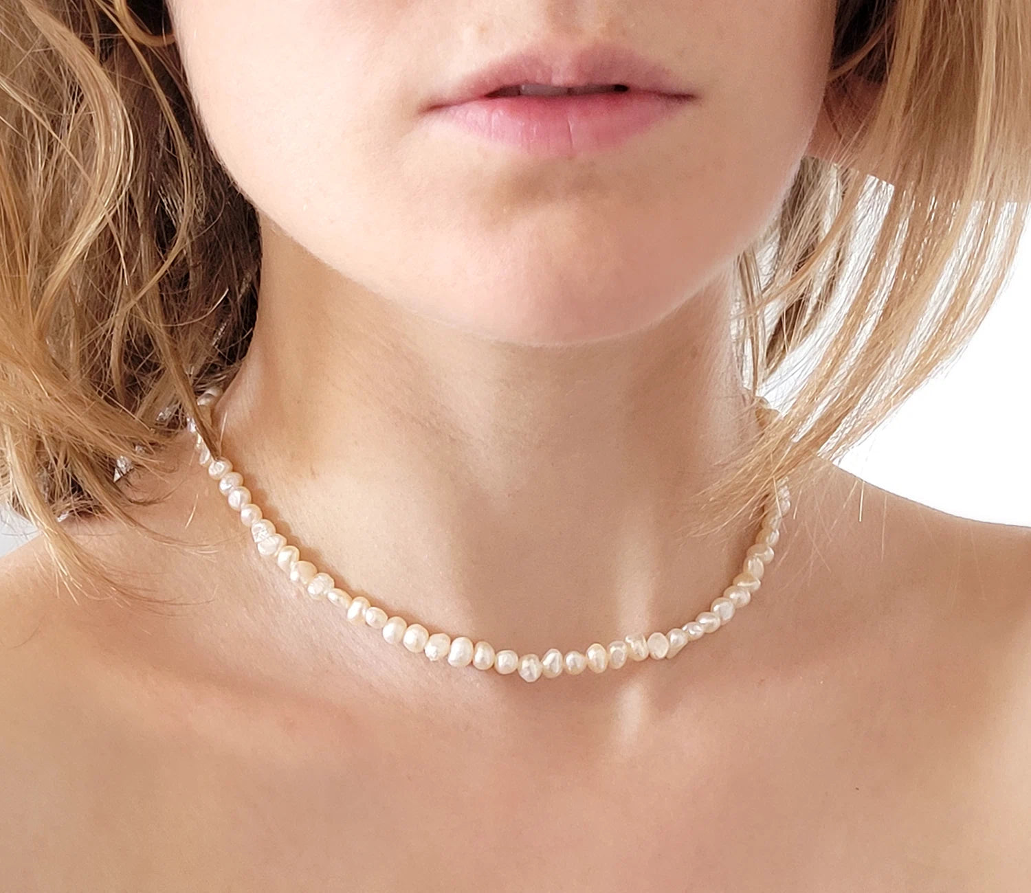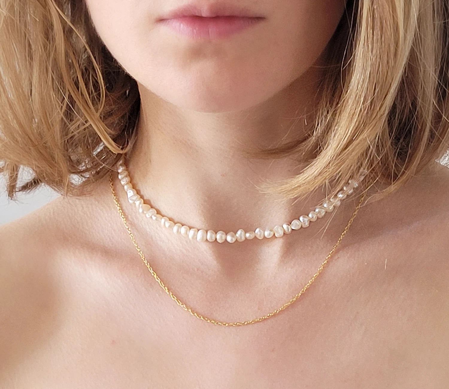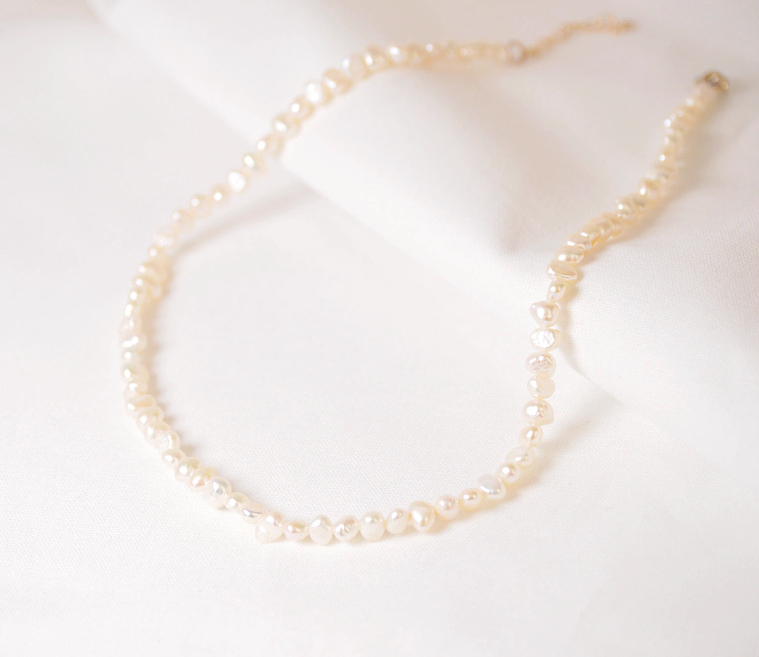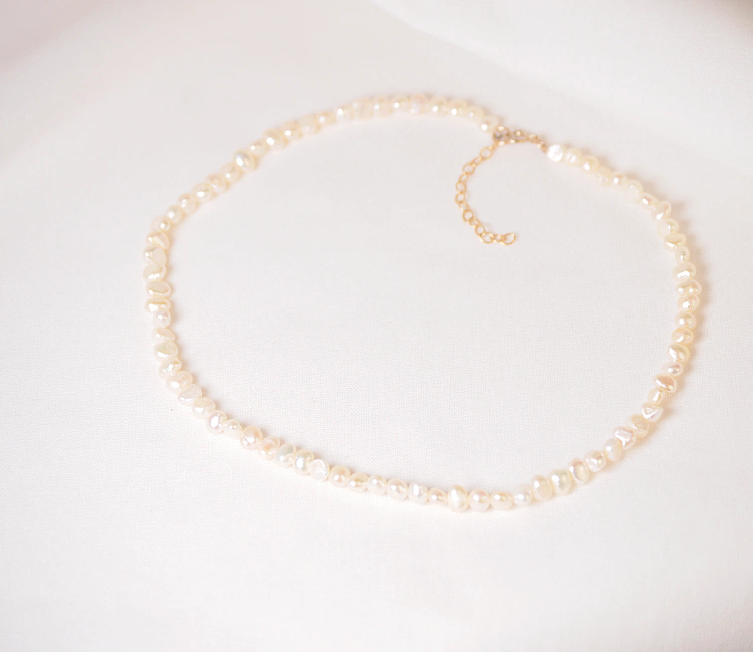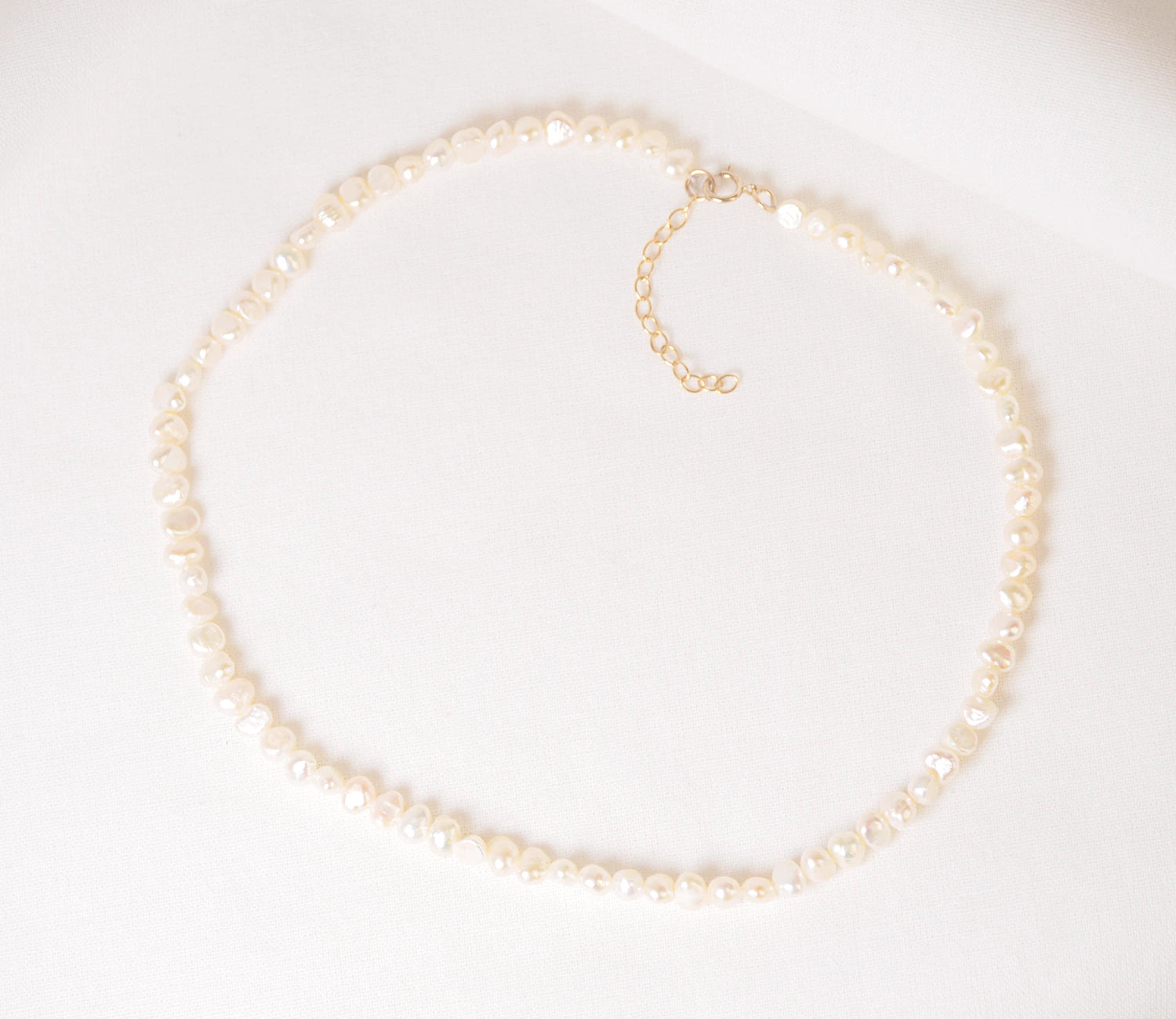 Unser atemberaubender handgefertigter Halsreif aus Naturperlen ist das perfekte Accessoire, um Ihren Stil zu unterstreichen und ein Statement zu setzen. Dieses mit Sorgfalt gefertigte Halsband besteht aus natürlichen Perlen und einer verstellbaren, mit 14-karätigem Recyclinggold gefüllten Kette. Die elegante Kordelkette verleiht jedem Outfit einen Hauch von Raffinesse und ist somit ideal für lässige und formelle Anlässe. Dank seiner Vielseitigkeit können Sie es einzeln tragen oder für einen trendigen Look mit anderen Halsketten kombinieren. Die Kombination aus glänzenden Perlen und einer nachhaltigen goldgefüllten Kette schafft ein faszinierendes und umweltfreundliches Stück.